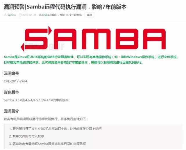 【群暉快報(bào)】2017年5月24日Samba發(fā)布了4.6.4版本,修復(fù)了一個(gè)嚴(yán)重的遠(yuǎn)程代碼執(zhí)行漏洞,漏洞編號(hào)CVE-2017-7494。安全漏洞可以讓一個(gè)有權(quán)限的用戶提權(quán)至Samba所在服務(wù)器的root權(quán)限,進(jìn)而執(zhí)行惡意程序,向該服務(wù)器發(fā)動(dòng)攻擊。